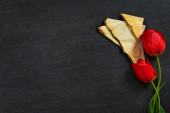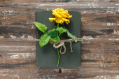 Bukiet pięknych żółtych róż i stos starych książek vintage na drewnianym tle. Kopiuj miejsce na nostalgiczny napis.