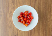 Małe czerwone pomidory wiśniowe na talerzu w kolorze żywności grupy