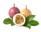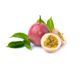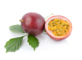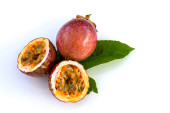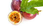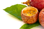 Maracuja przecięta na pół i w całości w małym szklanym pojemniku skórka owocu z drewnianą łyżką i liściem na białym tle. Owoce marakuji z sokiem owocowym i nasionami.