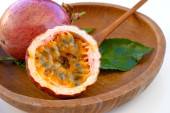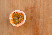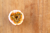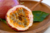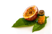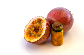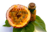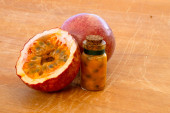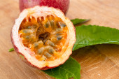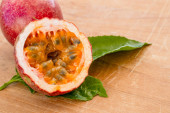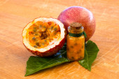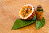 Maracuja przecięta na pół w butelce i kolbie oraz cała z liściem na drewnianym tle. Owoce marakuji z sokiem owocowym i nasionami.