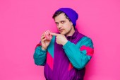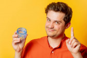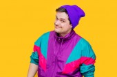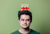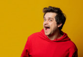 Guy w zielonej bluzie z kapeluszem świątecznym w żółtym tle