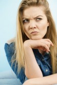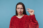Portret emocjonalnej kobiety w niebieskiej koszuli z jasnym makijażem gestykulującej rękami Kopiuj przestrzeń