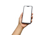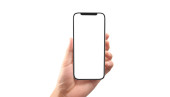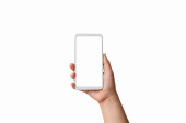 Ręka trzyma biały ekran, telefon komórkowy jest odizolowany na białym tle ze ścieżką wycinania.