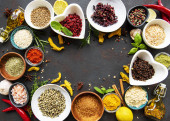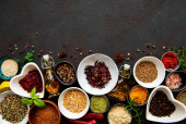 Zdjęcie "Różny asortyment przypraw na czarnym kamiennym tle. Widok z góry. " może być wykorzystywane do celów osobistych i komercyjnych zgodnie z warunkami zakupionej licencji Royalty-free. Obraz jest dostępny do pobrania w jakości wysokiej rozdzielczości do 5760x3840.