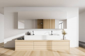 Zdjęcie "Wnętrze stylowej kuchni z białymi i drewnianymi ścianami, betonowa podłoga, białe szafki i makiety plakat. 3d renderowanie" może być wykorzystywane do celów osobistych i komercyjnych zgodnie z warunkami zakupionej licencji Royalty-free. Obraz jest dostępny do pobrania w jakości wysokiej rozdzielczości do 5760x3840.