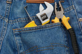 Narzędzia w kieszeni dżinsów. Koncepcja serwisu i inżynierii. Ilustracja 3D