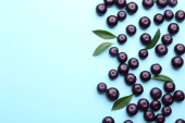 Świeże jagody acai na jasnoniebieskim tle, płaskie ułożenie