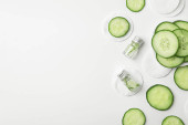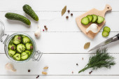 Słoik ze świeżo dojrzewającymi ogórkami i przyprawami na szarym stole, płaskie ułożenie. Miejsce na tekst