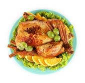Kompozycja z całości pieczona z kurczaka z warzywami, serwetka kolor, na talerzu, na białym tle