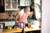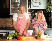 Zdjęcie "Starsza para bawiąca się w kuchni zdrowym jedzeniem. Mężczyzna i kobieta przygotowują lunch z bio warzywami. Szczęśliwy starsza koncepcja z dojrzałym śmieszne emeryta." może być wykorzystywane do celów osobistych i komercyjnych zgodnie z warunkami zakupionej licencji Royalty-free. Obraz jest dostępny do pobrania w jakości wysokiej rozdzielczości do 5760x3840.