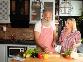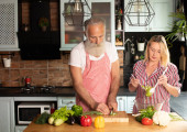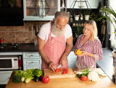 Zdjęcie "Starsza para bawiąca się w kuchni zdrowym jedzeniem. Mężczyzna i kobieta przygotowują lunch z bio warzywami. Szczęśliwy starsza koncepcja z dojrzałym śmieszne emeryta." może być wykorzystywane do celów osobistych i komercyjnych zgodnie z warunkami zakupionej licencji Royalty-free. Obraz jest dostępny do pobrania w jakości wysokiej rozdzielczości do 5760x3840.