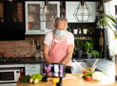 Zdjęcie "Starsza para bawiąca się w kuchni zdrowym jedzeniem. Mężczyzna i kobieta przygotowują lunch z bio warzywami. Szczęśliwy starsza koncepcja z dojrzałym śmieszne emeryta." może być wykorzystywane do celów osobistych i komercyjnych zgodnie z warunkami zakupionej licencji Royalty-free. Obraz jest dostępny do pobrania w jakości wysokiej rozdzielczości do 5760x3840.