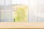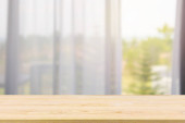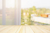 Pusty blat drewniany z zasłoną okienną abstrakcyjne rozmycie tła do wyświetlania produktu