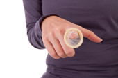 Prezerwatywa w dłoni dziewczyny na ciemnym tle. Akcesoria seksualne zbliżenie.
