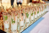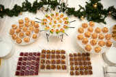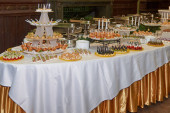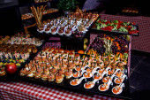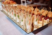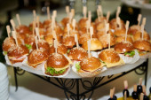 Zdjęcie "Stolik w formie bufetu z mini hamburgerami, przekąskami, kanapkami i przystawkami w luksusowym weselu, przestrzeń do kopiowania. Podawanie jedzenia i przystawek w restauracji. Stolik bankietowy " może być wykorzystywane do celów osobistych i komercyjnych zgodnie z warunkami zakupionej licencji Royalty-free. Obraz jest dostępny do pobrania w jakości wysokiej rozdzielczości do 5760x3840.