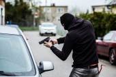 Porwanie samochodu. Groźba pistoletu. Uzbrojony atak. Człowiek w czarnej kominiarce, złodziej, porywacz z bronią w ręku..