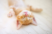 Zdjęcie "Kot śpi. Ginger kotek na kanapie pod kocem na drutach. Domowe zwierzę. Śpij i śpij spokojnie. Domowe zwierzę. Młode koty. słodkie śmieszne koty w domu." może być wykorzystywane do celów osobistych i komercyjnych zgodnie z warunkami zakupionej licencji Royalty-free. Obraz jest dostępny do pobrania w jakości wysokiej rozdzielczości do 5760x3840.