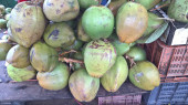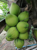 Świeże zielone orzechy kokosowe, kokosy, Cocos nucifera jest członkiem rodziny palm
