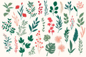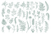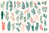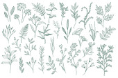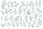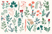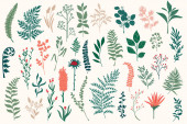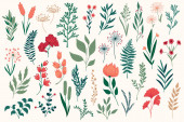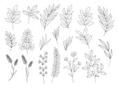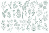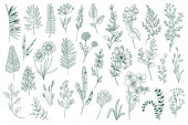 Pakiet kwiatowych elementów dekoracyjnych. Zestaw botanicznych bazgrołów, pakiet kwiatowy. Zielone liście, kwiaty, zioła i gałęzie wektor ilustracji. Idealny na zaproszenia, kartki okolicznościowe i broszury.
