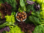 widok z góry - różne jadalne świeże zioła, zieleniny zielone i fioletowe są układane w kole, w centrum są czerwone pomidory, papryka i cebula burgundowa
