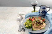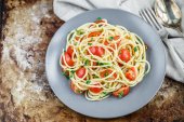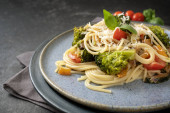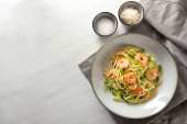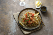Makaron spaghetti z warzywami i krewetkami, śródziemnomorski posiłek na niebieskim talerzu i ciemnym rustykalnym tle, przestrzeń do kopiowania, widok z góry pod wysokim kątem