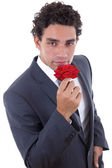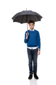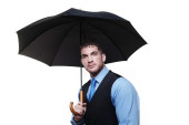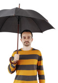 mężczyzna trzymając parasol w kurtkę z szalikiem w okularach