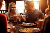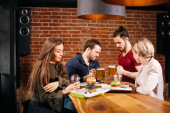 Grupa młodych ludzi delektuje się pysznymi hamburgerami w barze hamburgerowym
