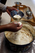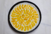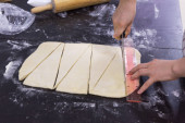 Dłonie kobiety nakładają kawałki moreli na surowe ciasto