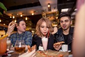 Grupa młodych ludzi siedzi w kawiarni, rozmawia i cieszy się