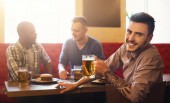 Grupa młodych ludzi siedzi w kawiarni, rozmawia i cieszy się
