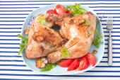Kompozycja z całości pieczona z kurczaka z warzywami, serwetka kolor, na talerzu, na białym tle