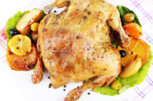 Kompozycja z całości pieczona z kurczaka z warzywami, serwetka kolor, na talerzu, na białym tle