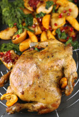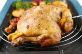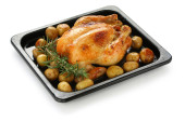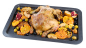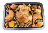 kurczak cały pieczony z warzywami na tacę, na białym tle