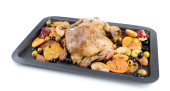 kurczak cały pieczony z warzywami na tacę, na białym tle