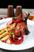 domowe smażonego kurczaka podudzia z warzyw na talerzu, na tle drewniane