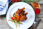 domowe smażonego kurczaka podudzia z warzyw na talerzu, na tle drewniane