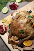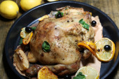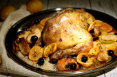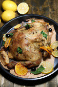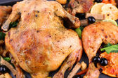cały pieczony kurczak z warzywa na patelni, na tle drewniane