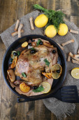 cały pieczony kurczak z warzywa na patelni, na tle drewniane