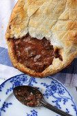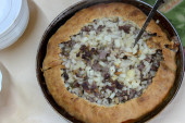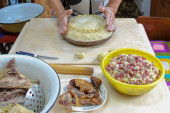 Widok z góry na otwarte ciasto mięsne. Krajowa żywność tatarska