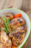 domowe smażonego kurczaka podudzia z warzyw na patelni, na tle drewniane