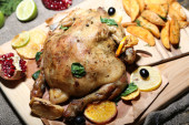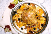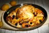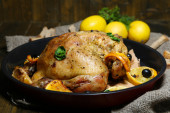 pollo intero arrosto con verdure in teglia, su fondo in legno