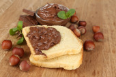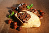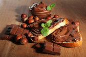 chleb z słodka czekolada z orzechami laskowymi rozprzestrzenił się na drewniane tła