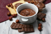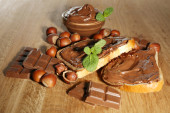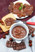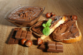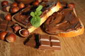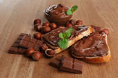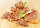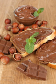 chleb z słodka czekolada z orzechami laskowymi rozprzestrzenił się na drewniane tła