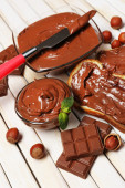 słodka czekolada z orzechami laskowymi z całych orzechów i mięty na drewniane tła