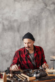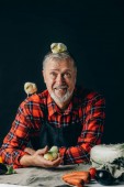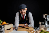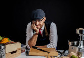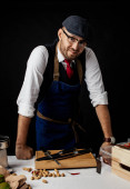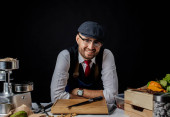 Restauracja Chef patrzy pewnie na kamerę na czarnym tle.