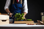 Człowiek gotowanie zielony burger z wołowiny, sałatki i warzyw.