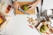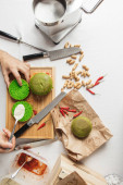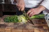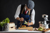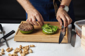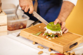 Szef kuchni dodaje bazylii na hamburgera gotowania koncepcji hamburgera