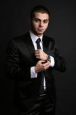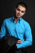 przystojny młody mężczyzna w kostiumie na ciemnym tle
