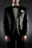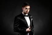 przystojny młody mężczyzna w kostiumie na ciemnym tle
