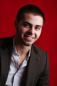 przystojny młody mężczyzna w kostiumie na ciemnym tle